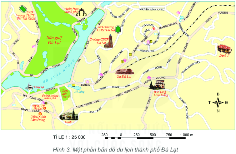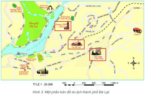 1. Tìm trên bản đồ hình 3 các địa điểm: Trường Cao đẳng Sư phạm Đà Lạt, Ga Đà Lạt, Bảo tàng Lâm Đồng.