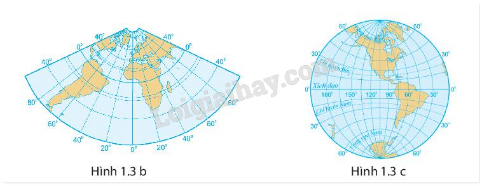 Dựa vào nội dung mô tả lưới kinh, vĩ tuyến của bản đồ thế giới (hình 1.3 a), hãy mô tả đặc điểm lưới kinh, vĩ tuyến của các hình còn lại (hình 1.3 b và 1.3 c).