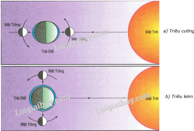 Hình 18.3. Vị trí của Mặt Trời, Mặt Trăng và Trái Đất vào các ngày triều cường và triều kém