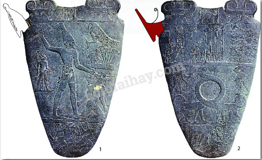- Quá trình thống nhất đất nước bằng chiến tranh được thê hiện ở chi tiết chim ưng thần bảo hộ của các vua pharaong dưới con chim ưng là là danh sách những nước bị vua Na-mơ đánh bại, bên dưới là hình ảnh tù binh, mặt bên kia là hình ảnh quân đội xếp hàng, cho thấy việc thống nhất đất nước là dùng biện pháp chiến tranh.