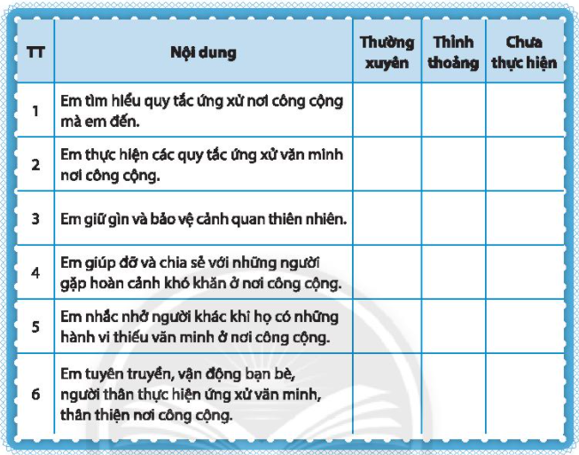 Em thực hiện các quy tắc ứng xử văn minh nơi công cộng. |