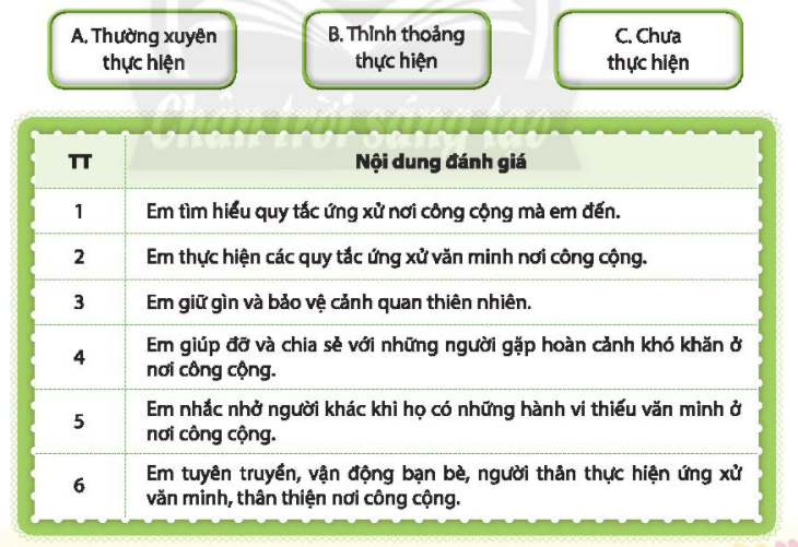 Chia sẻ về những thuận lợi và khó khăn khi thực hiện các hoạt động trong chủ đề này. Với mỗi nội dung đánh giá sau đây, hãy xác định một mức độ phù hợp nhất với em.