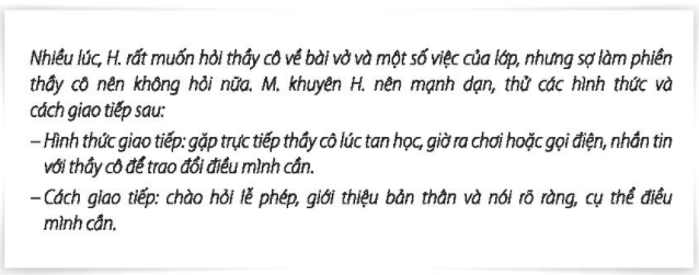 Tìm hiểu những gợi ý của M. dành cho H. trong tình huống sau để giao tiếp với thầy cô. Em hãy chia sẻ hình thức và cách giao tiếp của em với thầy cô.