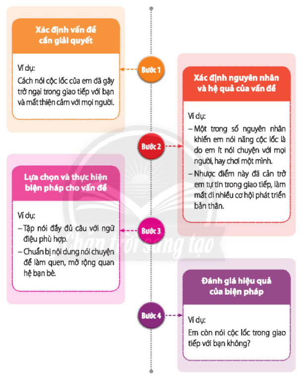 Đọc kĩ bốn bước giải quyết vấn đề và ví dụ mình họa sau. Em đã thực hiện được những bước nào trong giải quyết vấn đề về mối quan hệ bạn bè. Hãy chia sẻ với thầy cô và bạn bè.