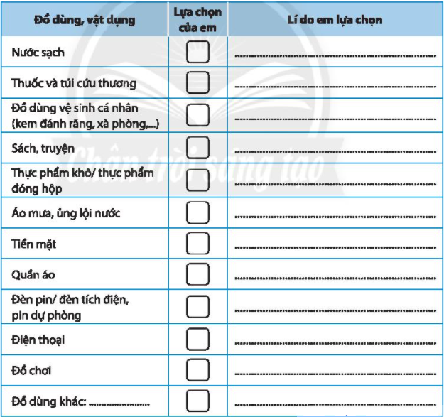 Đánh dấu tích vào ô trống chỉ những vật dụng em sẽ chuẩn bị nếu khu vực em đang sinh sống có nguy cơ mưa bão dài ngày, lũ lụt dâng cao. Giải thích lí do em lựa chọn.