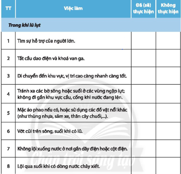 Đánh dấu X vào chỗ trống những việc em đã (sẽ) thực hiện hoặc không thực hiện trong khi lũ lụt và sau khi lũ rút trong bảng dưới đây: