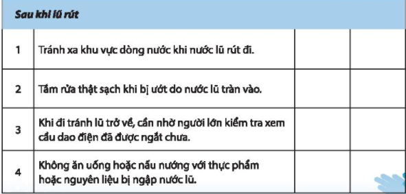 Đánh dấu tích vào ô trống chỉ những vật dụng em sẽ chuẩn bị nếu khu vực em đang sinh sống có nguy cơ mưa bão dài ngày, lũ lụt dâng cao. Giải thích lí do em lựa chọn. Đánh dấu X vào chỗ trống những việc em đã, sẽ thực hiện hoặc không thực hiện trong khi lũ lụt và sau khi lũ rút trong bảng dưới đây.