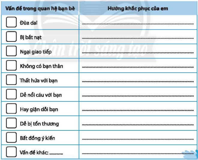Tô màu vào ô trước những vấn đề em gặp phải trong mối quan hệ bạn bè. Viết hướng khắc phục của em cho những vấn đề đó.