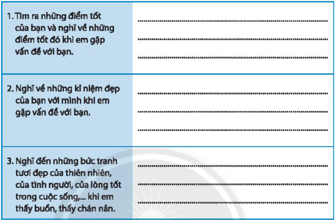 1. Tìm ra những điểm tốt của bạn và nghĩ về những điểm tốt đó khi em gặp vấn đề với bạn. |