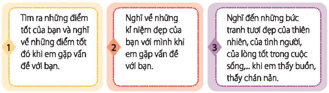 - Tìm ra những điểm tốt của bạn và nghĩ về những điểm tốt khi em gặp vấn đề với bạn: Khi em xích mích với bạn Minh, em đã ngồi lại và suy nghĩ thật ra Minh vẫn là người bạn tốt, đáng quý của em.