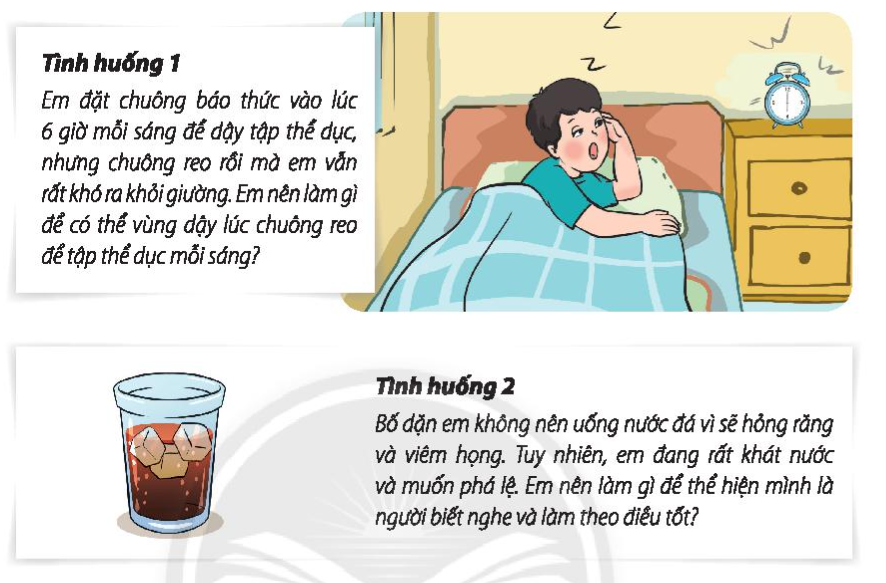 - Tình huống 1: Em có thể ngủ sớm hơn vào hôm trước để có thể dậy sớm hơn. Em có thể đặt chuông cách nhau vài phút liên tiếp để có thể dậy được.