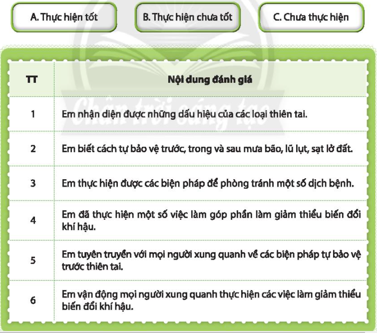 Chia sẻ về những thuận lợi và khó khăn khi thực hiện các hoạt động trong chủ đề này. Với mỗi nội dung đánh giá sau đây, hãy xác định một mức độ phù hợp nhất với em.