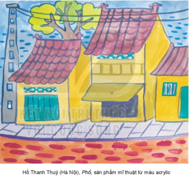 - Trong bài của bạn Thủy, bức tranh được thể hiện bằng những hình ảnh như những ngôi nhà cổ với mái ngói đỏ, tường vàng, tiêu biểu cho những ngôi nhà ở làng quê Việt Nam