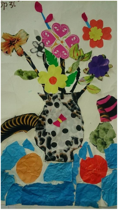 - Trong bức tranh, em đã xé những bông hoa cùng với lọ hoa là trung tâm, cũng là vật chính để em thể hiện ý tưởng. Những bông hoa mang màu sắc rực rỡ tượng trưng cho những bông hoa mà mẹ em mua về cắm mỗi tuần, còn lọ hoa là chiếc lọ quen thuộc để nhà em cắm hoa, đó cũng là vật để em thể hiện ý tưởng