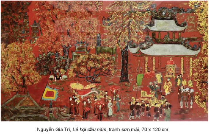 Sử dụng kiến thức đã học về hòa sắc, phân tích tranh sơn mài Lễ hội đầu năm của họa sĩ Nguyễn Gia Trí.