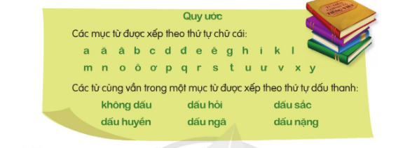 Đọc quy ước sau đây của một quyển từ điển và cho biết: Các từ trong quyển sách được sắp xếp theo thứ tự nào?
