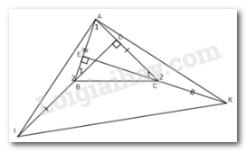 Cho \(\Delta ABC\) nhọn, hai đường cao BD và CE. Trên tia đối của tia BD lấy điểm I sao cho \(BI = AC\). Trên tia đối của tia CE lấy điểm K sao cho\(CK = AB.\)