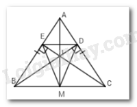 Cho \(\Delta ABC\) cân tại $A,$ hai đường cao $BD$ và $CE$ cắt nhau tại $I.$ Tia $AI$ cắt $BC$ tại $M.$ Khi đó \(\Delta MED\) là tam giác gì?