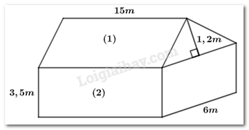 Theọ hình vẽ, ngôi nhà gồm hai phần: một phần là lăng trụ đứng có đáy là tam giác cân cạnh đáy bằng \(6m\), chiều cao đáy \(1,2m\), chiều cao lăng trụ bằng \(15m\); phần còn lại là hình hộp chữ nhật có kích thước đáy là \(6m\) và \(15m\), chiều cao \(3,5m\).