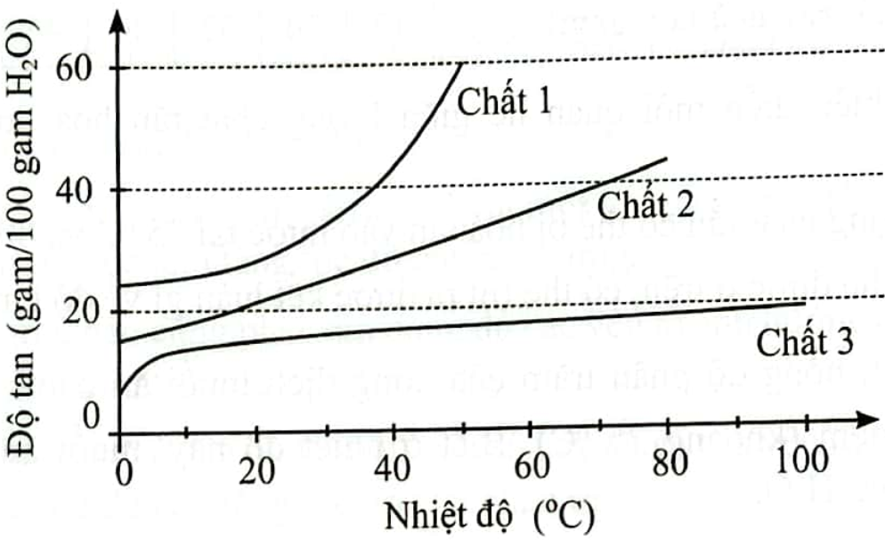 Đồ thị sau cho biết ảnh hưởng của nhiệt độ đến độ tan của ba chất khác nhau trong nước.