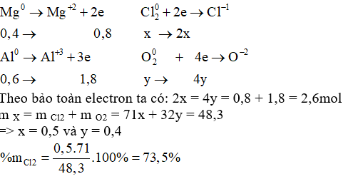 \(\begin{array}{l}M{g^0} \to M{g^{ + 2}} + 2e {\rm{ Cl}}_2^0 + 2e \to C{l^{ - 1}}\\x \to {\rm{ 2x 0,1}} \to {\rm{0,2}}\\{\rm{A}}{{\rm{l}}^0} \to A{l^{ + 3}} + 3e{\rm{ O}}_2^0{\rm{ }} + {\rm{ }}4e \to {{\rm{O}}^{ - 2}}{\rm{ }}\\y \to {\rm{ 3y 0,075}} \to 0,3\end{array}\)