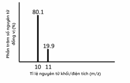 Cho phổ khối của nguyên tố A được biểu diễn tại hình 1.33, Nguyên tử khối trung bình của A là