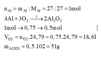 Đốt cháy hoàn toàn 27 gam Al trong oxi thu được Al2O3. Tính khối lượng Al2O3 thu được và thể tích oxygen (đkc) đã dùng.