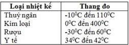 Bảng dưới đây ghi tên các nhiệt kế và thang đo của chúng. Để đo nhiệt độ của môi trường ta dùng nhiệt kế nào?