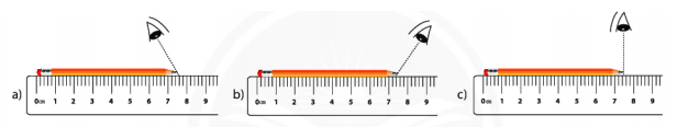 Quan sát hình vẽ và cho biết cách đặt mắt để đọc chiều dài bút chì như hình nào là đúng?