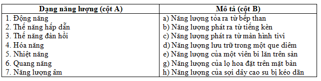Ghép tên dạng năng lượng ở cột A phù hợp với phần mô tả ở cột B.