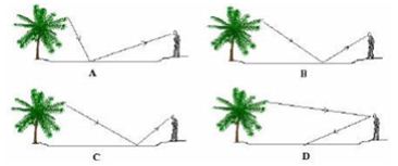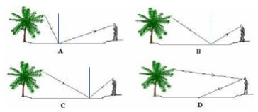 Một người nhìn xuống mặt hồ và thấy đỉnh ngọn cây. Hình vẽ nào sau đây mô tả đúng đường đi của tia sáng đến mắt ta?