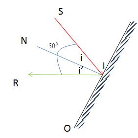 Một tia sáng \(SI\) truyền theo phương hợp mới mặt phẳng nằm ngang một góc \({50^0}\). Hỏi phải đặt gương phẳng hợp với mặt phẳng nằm ngang một góc bao nhiêu để tia phản xạ có phương nằm ngang.
