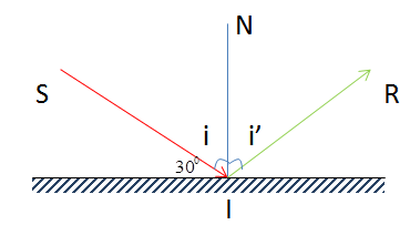 => Góc hợp bởi tia tới và tia phản xạ: \(\widehat {S{\rm{IR}}} = i + i' = {60^0} + {60^0} = {120^0}\)