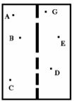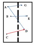 Có \(6\) bạn \(A,B,C,D,E,G\) ở trong phòng được ngăn cách bởi một bức tường có các lỗ. Hãy cho biết các bạn nào sẽ thấy được nhau: