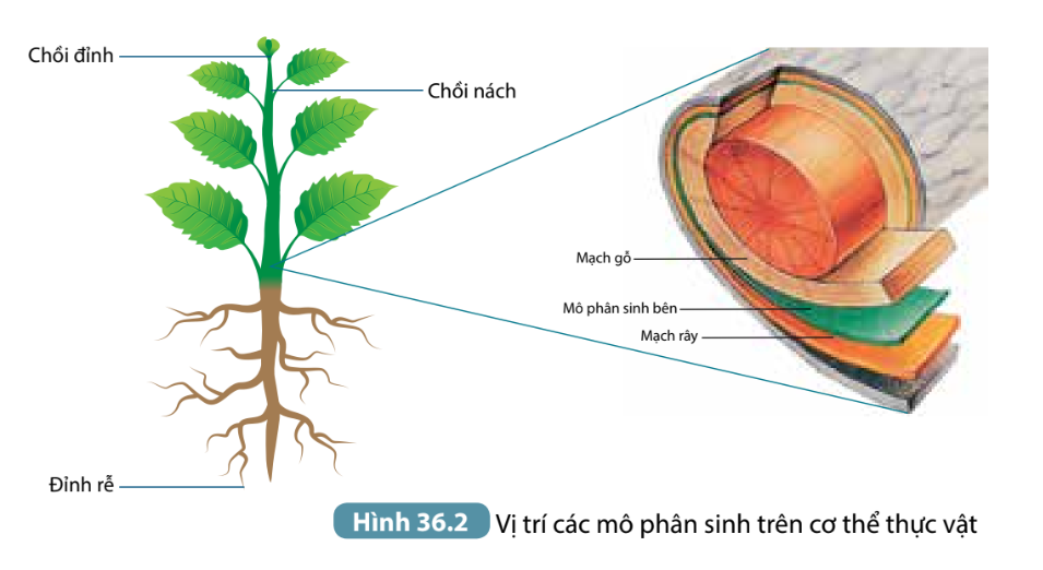 Thực vật sinh trưởng nhờ các mô phân sinh. Mô phân sinh đỉnh có ở đỉnh của rễ và đỉnh chồi giúp thân, cành và rễ tăng lên về chiều dài. Mô phân sinh bên giúp thân, cành và rễ tăng lên về chiều ngang.