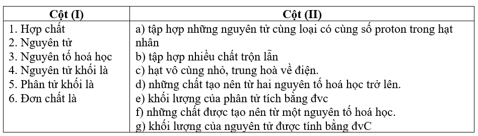 Hãy chọn mỗi khái niệm ở cột (I) sao cho phù hợp với một câu tương ứng ở cột (II)