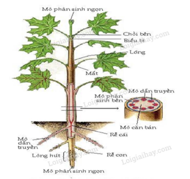 Ở cây Hai lá mầm, tính từ ngọn đến rễ là các loại mô phân sinh theo thứ tự: mô phân sinh đỉnh ngọn → mô phân sinh bên → mô phân sinh đỉnh rễ