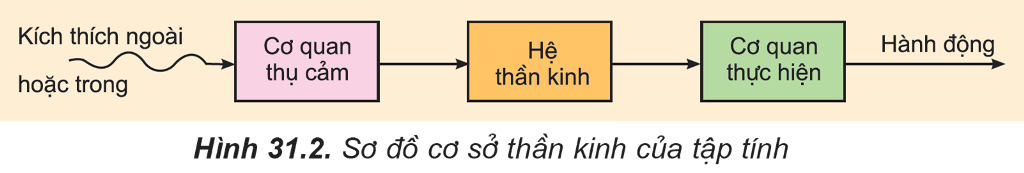 Sơ đồ mô tả đúng cơ sở thần kinh của tập tính là: kích thích → cơ quan thụ cảm → hệ thần kinh → cơ quan thực hiện → hành động