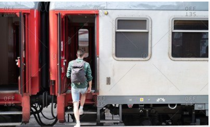 He is boarding a train.