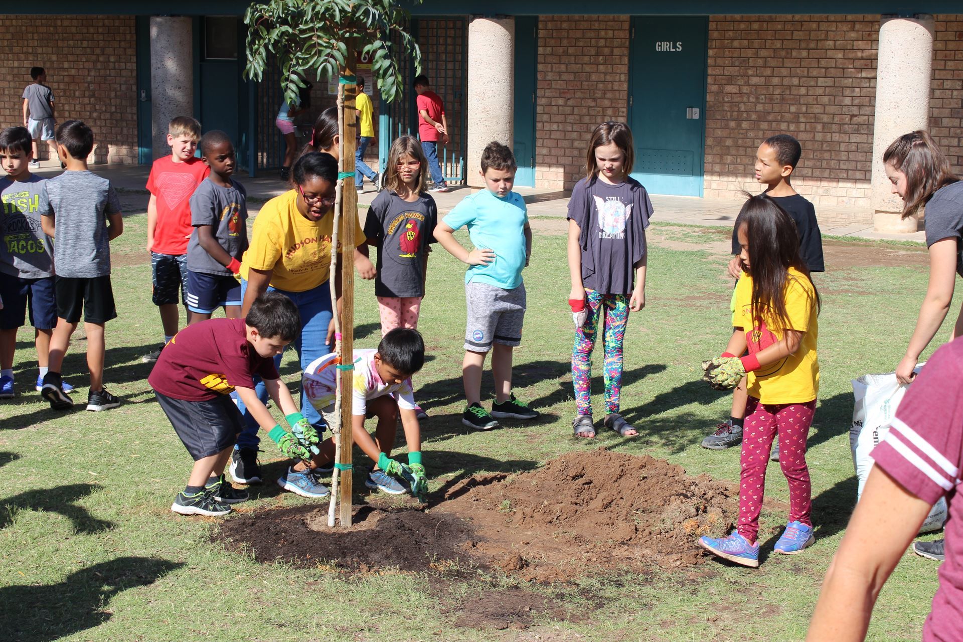 (Mình trồng cây xung quanh trường học.)