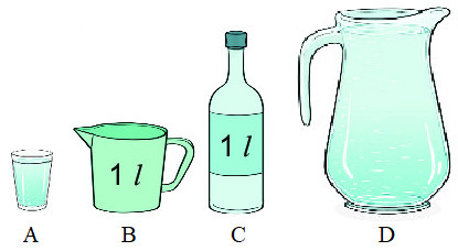 Vì: Cốc A đựng ít hơn 1 \(l\) nước, bình D đựng nhiều hơn 1 \(l\) nước, do đó cốc A đựng ít nước hơn bình D.