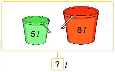 Thực hiện phép cộng với 2 số ghi trên mỗi chiếc xô và giữ nguyên đơn vị \(l\) ở kết quả vừa tìm được.