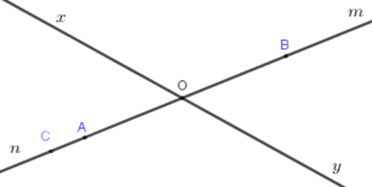 Vẽ đường thẳng $mn.$ Lấy điểm $O$ trên đường thẳng $mn,$ trên tia $Om$ lấy điểm $A,$ trên tia $On$ lấy điểm $B.$