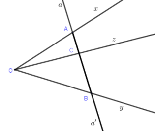 + Vẽ đường thẳng \(aa'\) cắt hai tia \(Ox;\,Oy\) theo thứ tự tại \(A\) và \(B\)(khác \(O\))