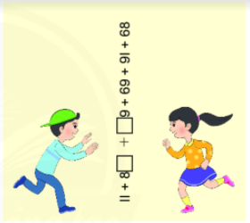 Toán vui. Hai bạn Na và Toàn đứng đối diện nhau trên nền đất, ở giữa họ có một dãy các số và dấu cộng như hình dưới đây. Do vị trí nhìn khác nhau nên hai bạn thấy hai dãy các phép tính khác nhau.