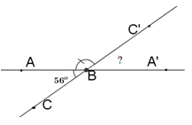 Cho \(\widehat {ABC} = {56^o}\). Vẽ \(\widehat {ABC'}\) kề bù với \(\widehat {ABC}\); \(\widehat {C'BA'}\) kề bù với \(\widehat {ABC'}\). Tính số đo \(\widehat {C'BA'}\).