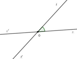 Vì hai đường thẳng $zz'$ và $tt'$ cắt nhau tại $A$ nên $Az'$ là tia đối của tia $Az,At'$ là tia đối của tia $At.$ Vậy góc đối đỉnh với \(\widehat {zAt'}\) là \(\widehat {z'At}\).