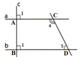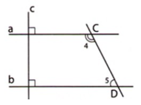 Vì \(a//b\,\,(cmt)\) nên \(\widehat {{C_4}} + \widehat {{D_5}} = {180^o}\) (hai góc trong cùng phía bù nhau) (1)