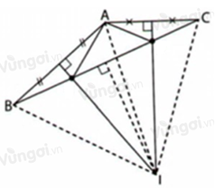 + Sử dụng tính chất ba đường trung trực của tam giác: “Ba đường trung trực của một tam giác cùng đi qua một điểm. Điểm này cách đều ba đỉnh của tam giác đó”, chứng minh \(IA = IB = IC\)