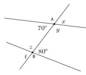 $x = {80^o};y = {110^0};z = {100^o};t = {70^o}$